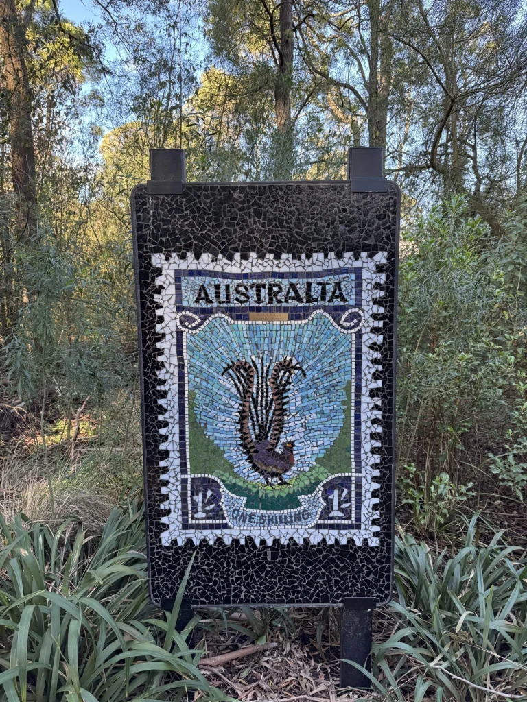 要所要所に、動物の切手を模して、タイルで描いた看板がある。孔雀もいる。