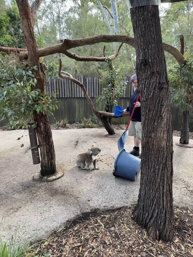 飼育員さんのもつホウキに、他のコアラの匂いがついているので、自分の匂いをつけに行っているそうです。紫色の髪の毛のファンキーな飼育員さんも素敵。